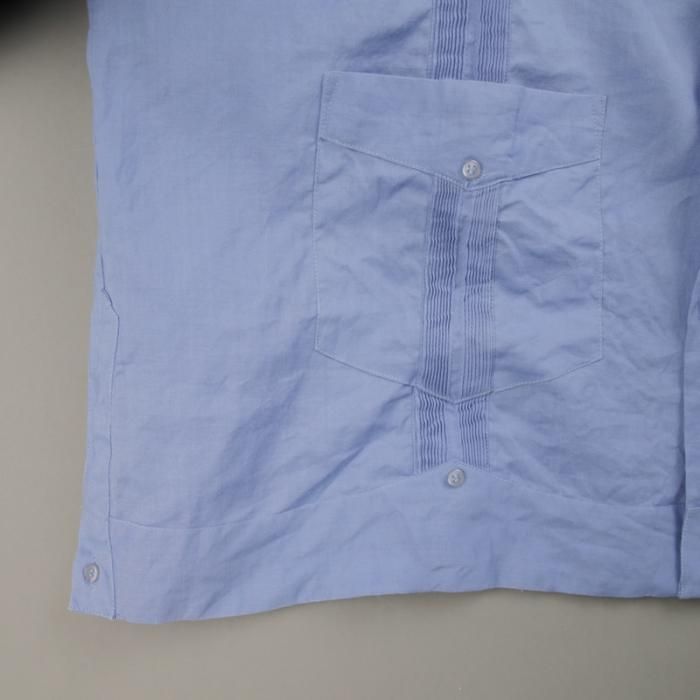 一見、Yシャツ、ボタンダウンシャツなど、ブルーのオックスフォード生地に見えるかもしれませんが、現物は麻特有の、シワ、よれ感。ざらついた涼しげな素材感です。