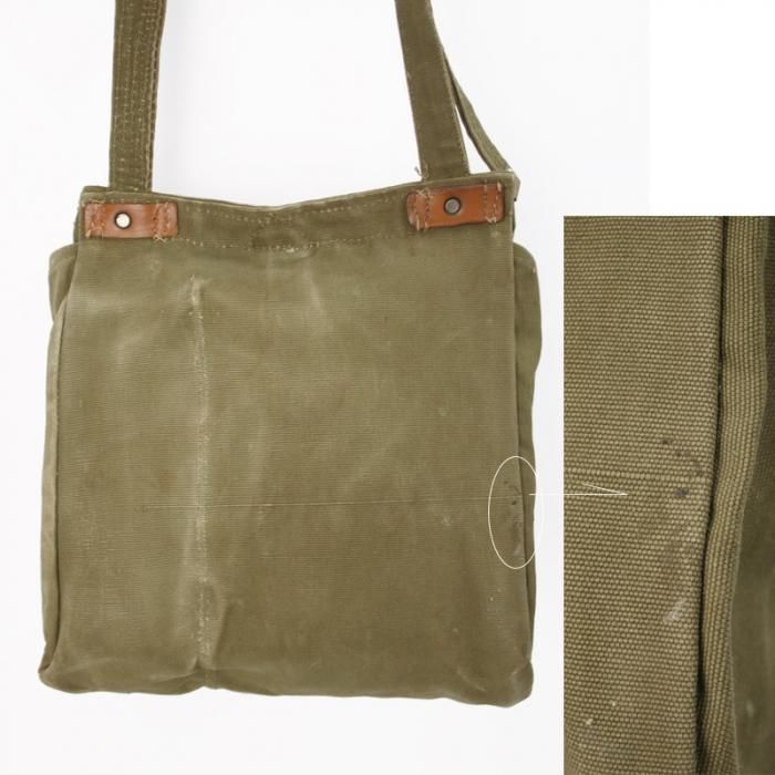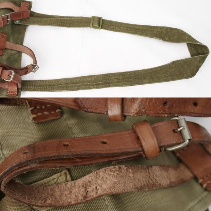 バッグ本体、あたり、色落ち、薄汚れありますが、軍のバッグ類としては使用感少なめ、レザーストラップはシミ、汚れのほか、ストラップの裏側、皮のささくれ、毛羽が立っています。