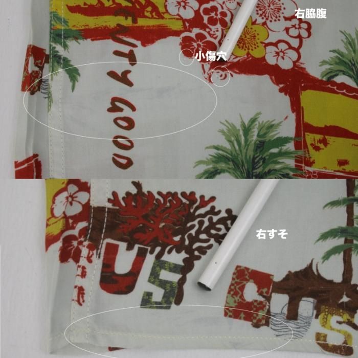 柄の中で、グレーっぽい部分、最初は絵柄の背景のように見えましたが、柄模様のインク移り、シミのようです。主に右脇腹、すそ、背中側首下、右腰、すそなどです。言われなければそのような柄なのか、わからないと思います。