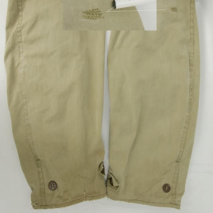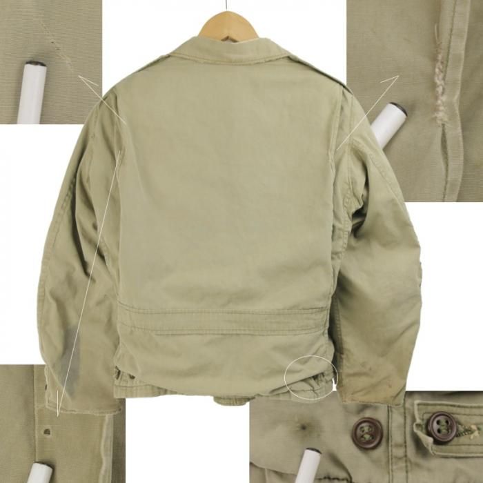 この年代のフィールドジャケットは薄いウールフランネル生地を固定裏地に使っているため、経年による縮みで内側から引っ張るため、縮みの少ない表生地がたるみます。特に背中が着丈短くなっています。表地と裏地のマテリアルの違いによるは背中の縮みは、初期のフライトJKTにも見られる症状です。レプリカにはないヴィンテージの証と前向きに捉えてください。余談ですが、M1943で、ライナー脱着仕様に改善されます。