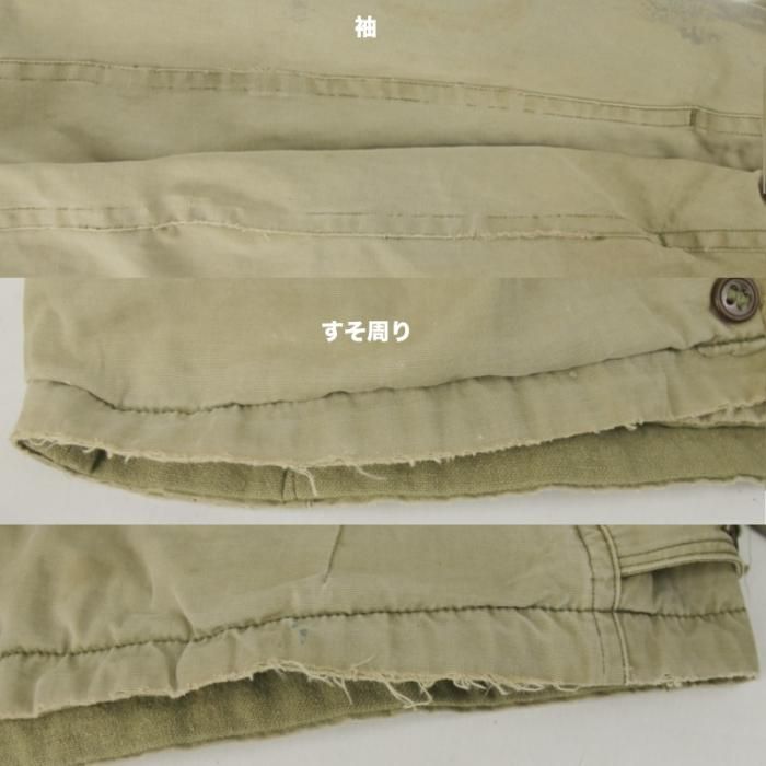 フィールドジャケットの名称でもこの当時は、薄手のコットンポプリン生地を使っているため、80年以上経過して襟、袖口、すそ、ポケット口など、摩耗してます。