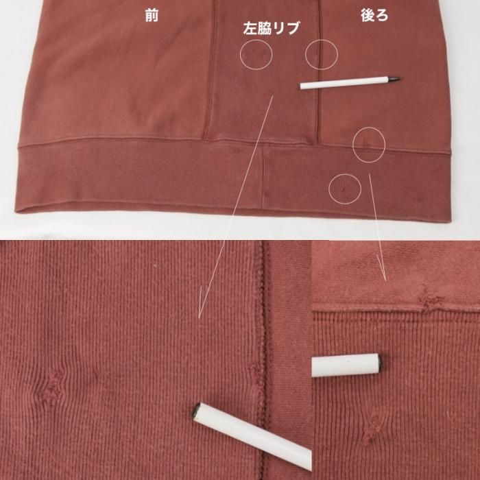 両サイド脇にリブ。左脇のリブに穴手縫修理x2、その後ろ側ウエストリブ部分にも修理跡x2