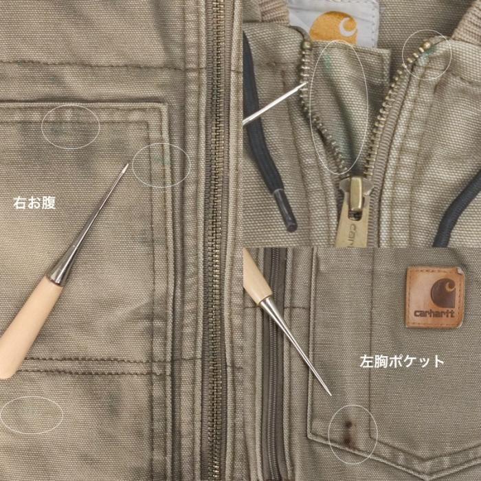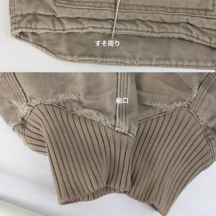 左右袖口リブ上の部分手縫いでリペアされています。カーハートジャケットのこの部分ウイークポイントで、ダメージ出やすい箇所です。